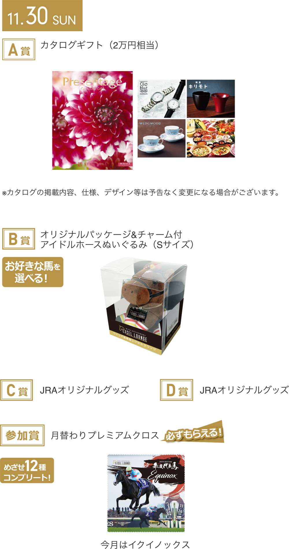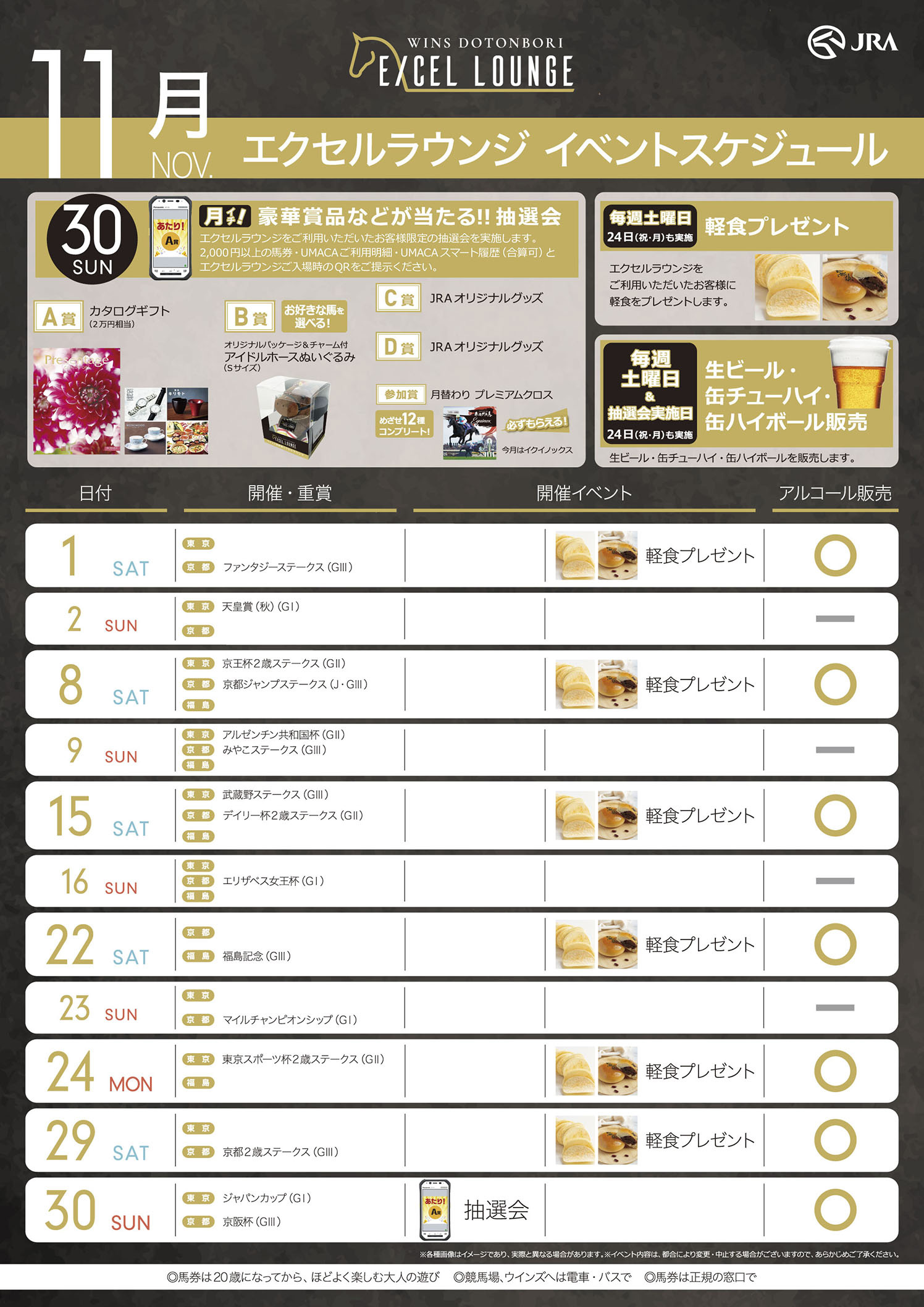 2,000円以上の馬券・UMACAご利用明細・UMACAスマート履歴(合算可)とエクセルラウンジご入場時のQRをご提示ください。