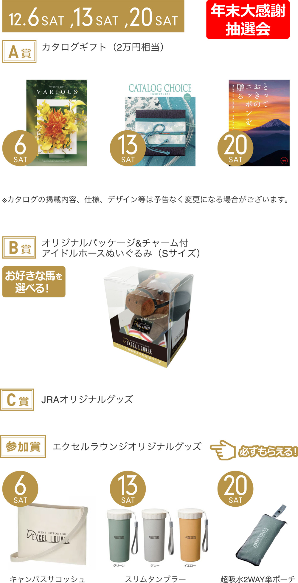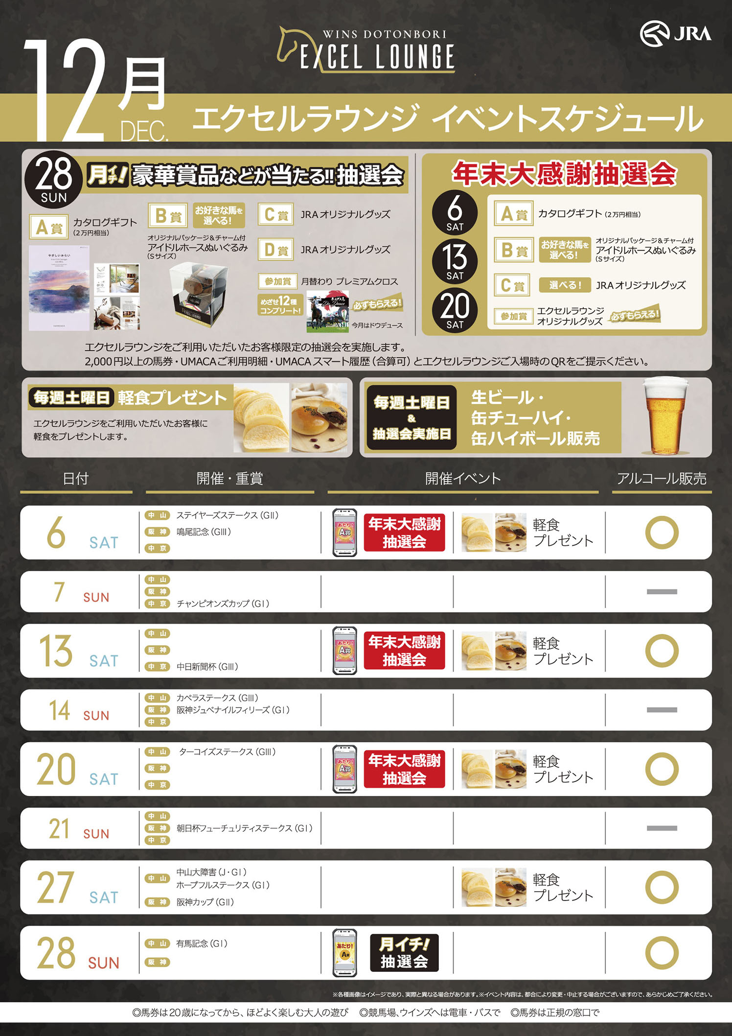 2,000円以上の馬券・UMACAご利用明細・UMACAスマート履歴(合算可)とエクセルラウンジご入場時のQRをご提示ください。